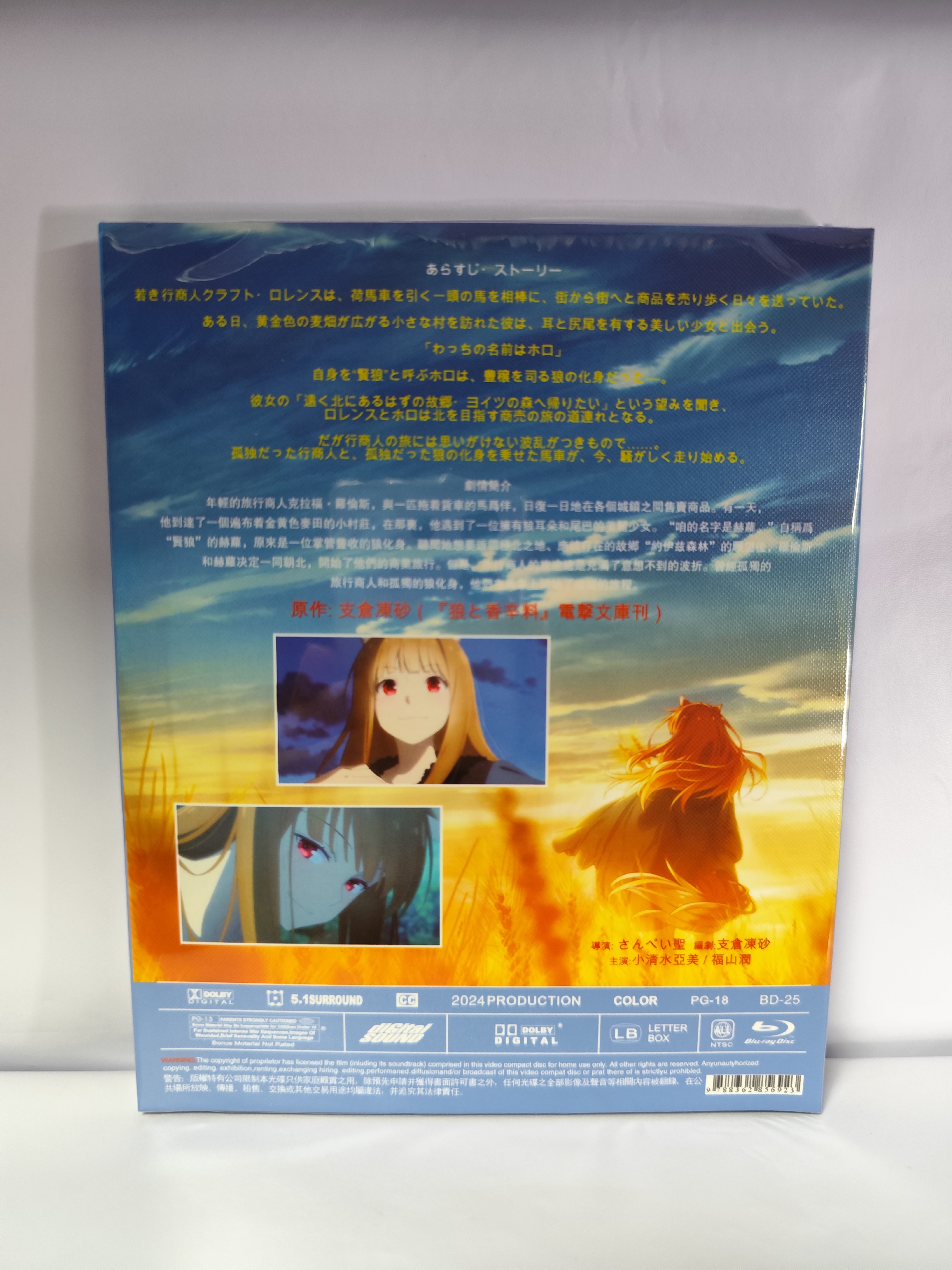 TVアニメ「狼と香辛料 MERCHANT MEETS THE WISE WOLF」DVD ブルーレイ Blu-ray BOX 日本語字幕 全巻 完全版。行商人のロレンスは麦の取引のため、収穫祭を間近に控えるパスロエ村に立ち寄った。だが、目当ての交渉人ヤレイは、豊作の神“ホロ”を祀る風習によって閉じ込められ、会えなくなってしまう。仕方なく村をあとにしたロレンスはその夜、荷馬車に忍び込んだ少女と出会う。彼女は獣耳と立派な尻尾をもち、村の神と同じ”ホロ“と名乗った。ホロを遥か北の故郷へと送り届けることになったロレンス。次の目的地へと向かう途中、土砂降りの雨に遭った二人は、雨宿りのため教会で一夜を過ごすことに。濡れた身体を乾かし、ロレンスが大広間の宿泊者と談笑していたところ、ゼーレンと名乗る駆け出しの商人から、胡散臭い儲け話を持ち掛けられる。ひとまず儲け話に乗ることにしたロレンスとホロは、ゼーレンと落ち合う約束をしていた港町パッツィオを訪れる。たくさんの露店が並ぶ広場で荷馬車いっぱいの林檎を堪能したあと、二人は積み荷のテンの毛皮を売るために、ミローネ商会へと赴く。ロレンスと商会の査定人が取引額について駆け引きをする中、突如ホロが商談に割り込んでくる。